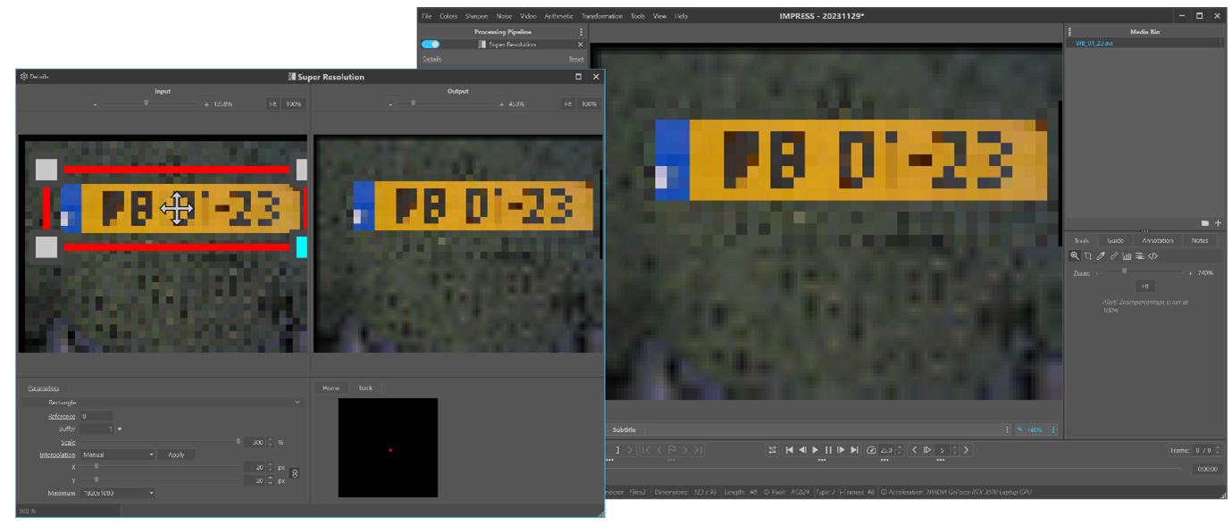 Figure 2: Loading the sequence in Impress and adjusting the parameters of the super resolution filter on the first frame.
